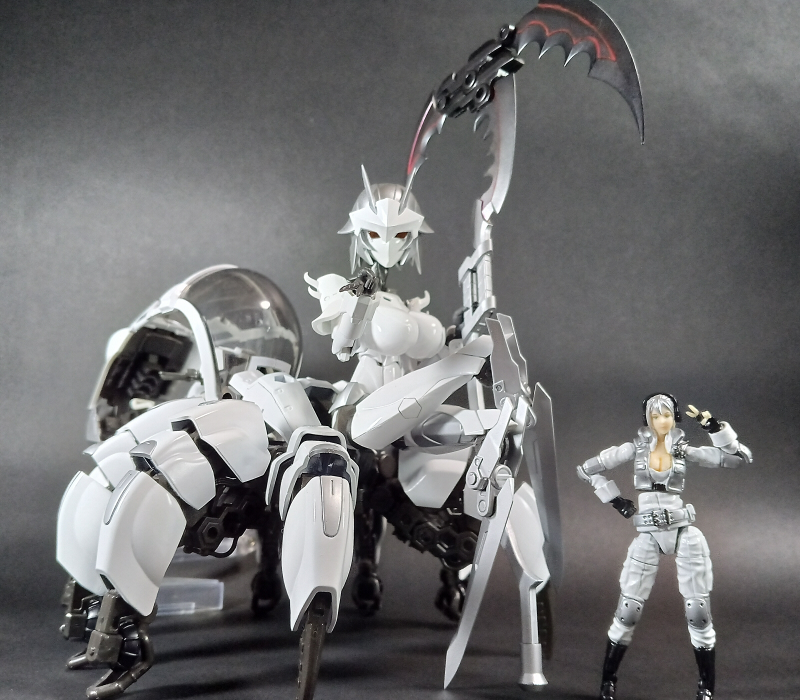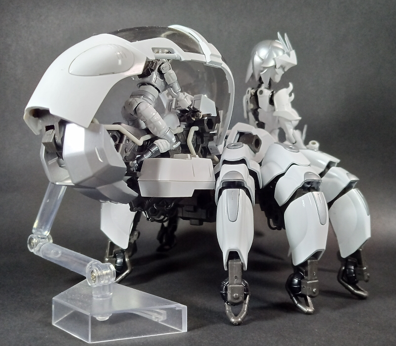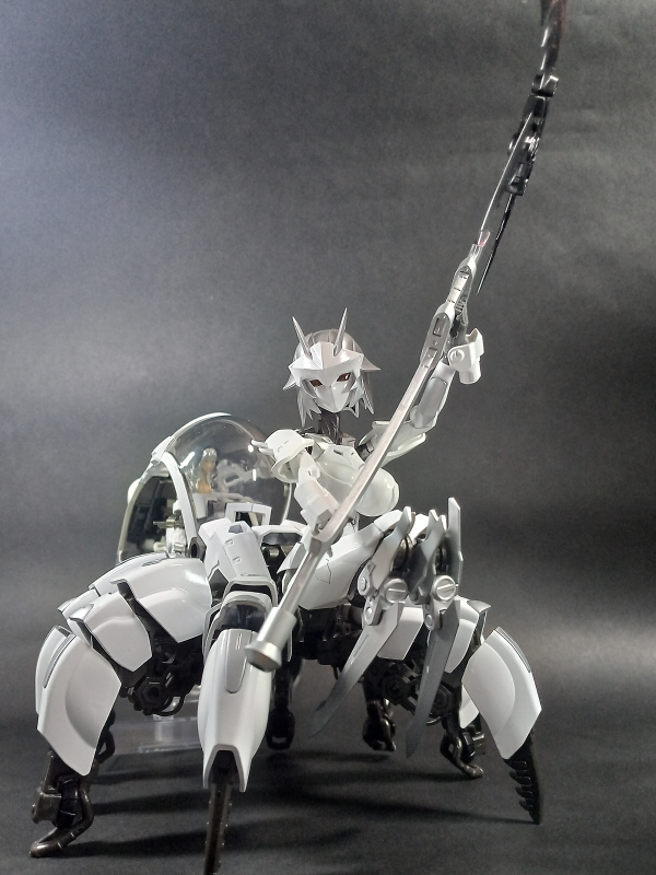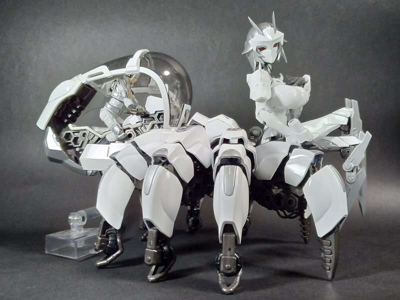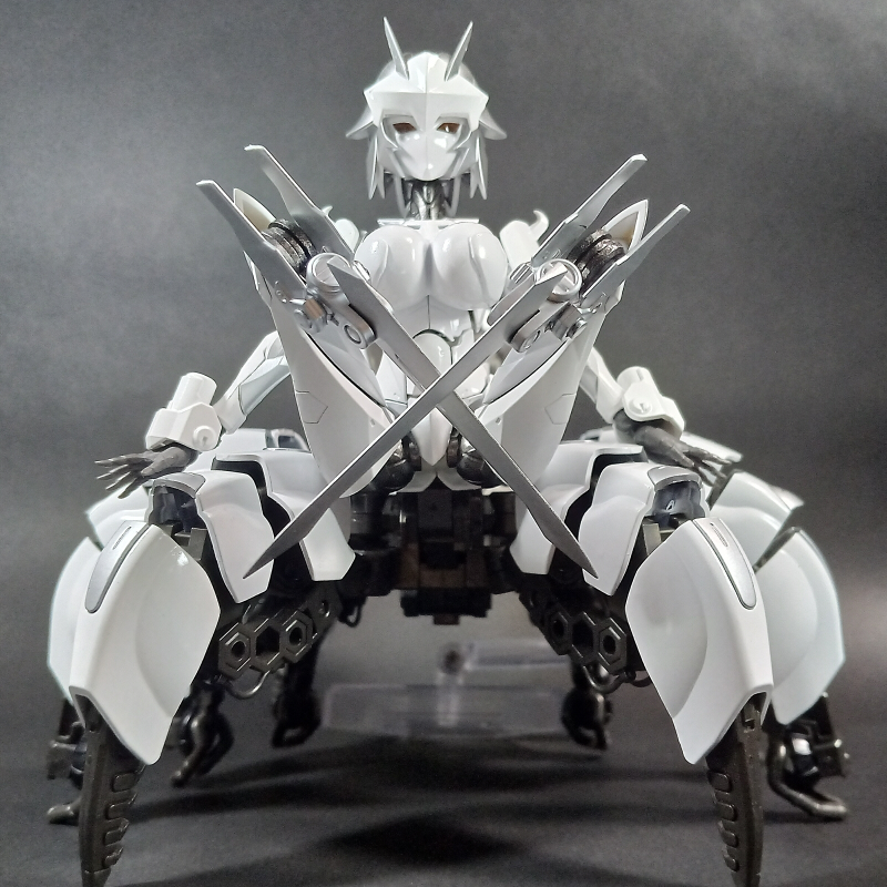最初、ヘキサギアとして作るかメガロマリアとして作るか悩んでいる時に蜘蛛のお腹部分をブロックバスターのコックピットにする事を思い付いて、今回はヘキサギアとして作りました。色はどうしよう名前はどうしようと考えてるうちにガバナーの設定も固まり、このような真っ白い機体になってしまいましたと。