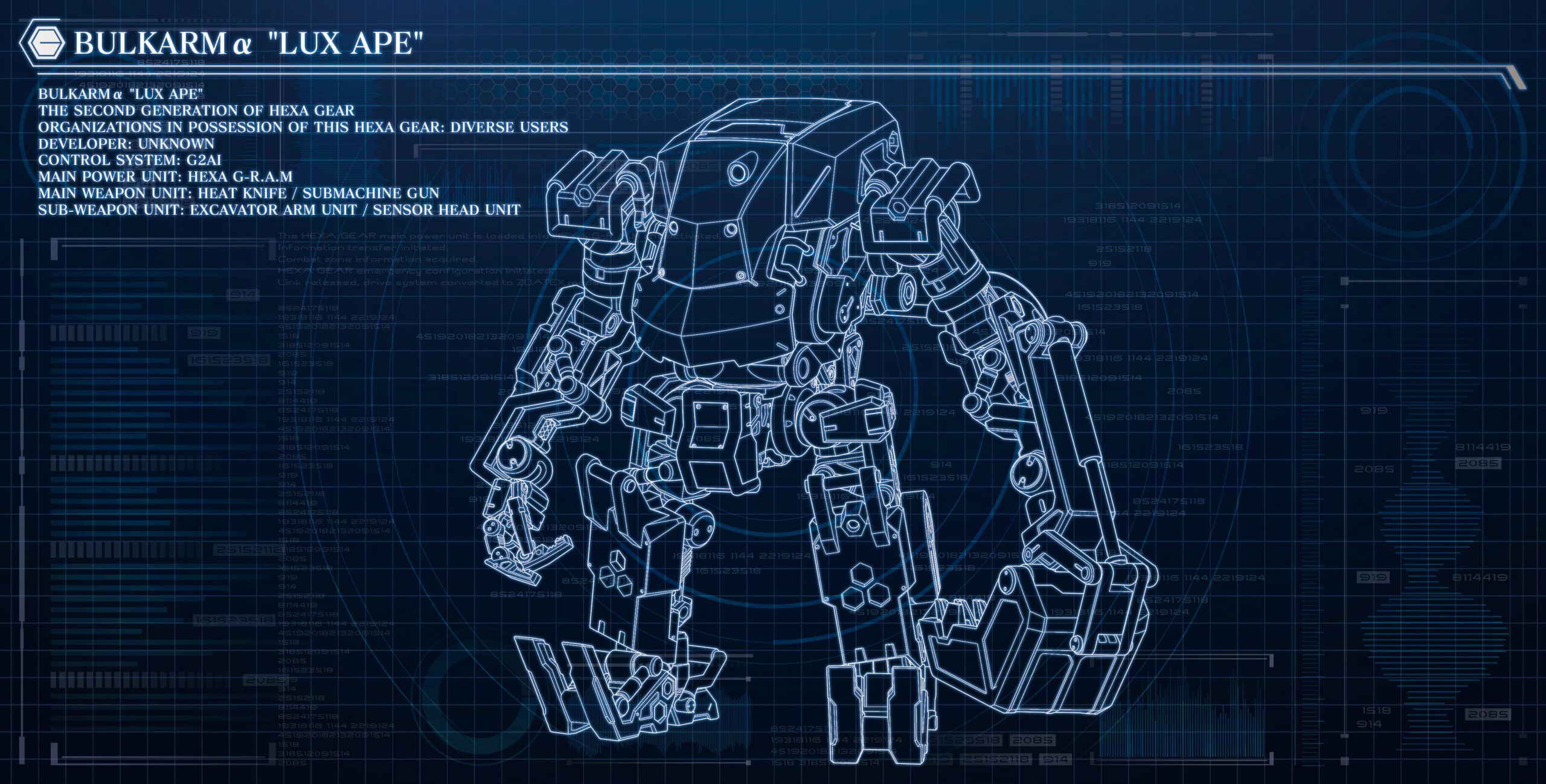 本機“ルクスエイプ”の正体は、広く流通したバルクアーム系列のフレームを流用しつつ同シリーズの代名詞とも言える重装甲を廃し、軽合金製の簡易ボディーシェルへの換装と腕部エクステンションパーツ、そして特徴的な大型バケットアームを搭載する事で民間用も含めた土木作業用機体としてリビルドする為のサードパーティ製オプションを装備した姿……“だった”物である。