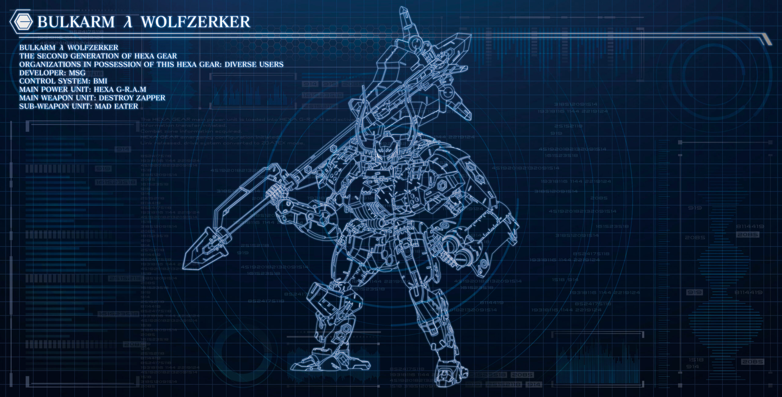 MSGヴァリアントフォースによって開発された第二世代高性能ヘキサギア「バルクアームλ」シリーズ。中でも「ウルフザルグ」の名を与えられた本タイプは、設計当初から多数用意されていた派生装備の一形態として“白兵戦”及び“格闘戦”への先鋭化を行い、標的と定めた敵ヘキサギアの迅速かつ確実な撃破を企図とした“駆逐型ヘキサギア”というコンセプトを持つ。